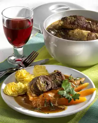 Melt the fat just before serving. Toss carrots and parsley in it. Refine sauce with cream. Sprinkle with sauce thickener. Season to taste with salt and pepper. Arrange roulades and sauce, carrots and sprinkled potatoes in portions.