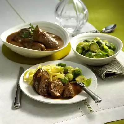 Add tomato paste. Season with salt and pepper. Add wine and porcini mushrooms with soaking water. Bring everything to the boil, cover and cook over medium heat for about 1 1/2 hours. Clean and wash the Brussels sprouts, put them into boiling salted water and cook for about 15 minutes. Remove the roulades and keep warm. Stir flour and some water until smooth and thicken the sauce with it. Season to taste with salt and pepper. Put the Brussels sprouts on a sieve and let them drip off. Melt butter in a pot. Swivel the sprouts in it. Serve roulades and Brussels sprouts together. Spätzle taste good with them
