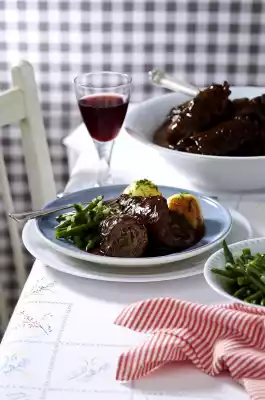 Heat the roulades in the sauce. Lift the dumplings out of the water and let them drain briefly. Arrange roulades and dumplings. Green beans taste good with them.