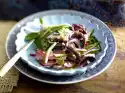 Cut the steak into slices and mix half of it with the prepared salad ingredients and dressing. Arrange the other slices on plates and place the salad on top. Sprinkle with a large pinch of roasted rice if desired.