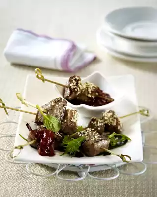 Roast the sesame seeds in a pan without fat until golden brown, take them out and put them on a plate. Drain the meat and place on small wooden skewers. Heat 2 tablespoons of oil in a frying pan. Fry the skewers for 2-3 minutes while turning. Remove from the pan and turn in sesame seeds. Arrange the salad leaves on 4 plates and sprinkle with the vinaigrette. Arrange the skewers on them, add the sauce