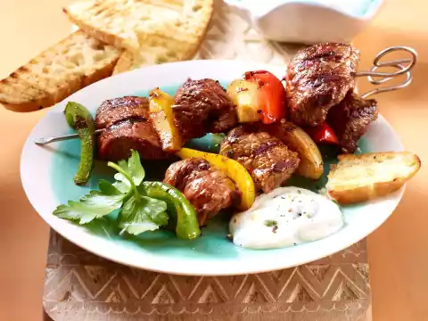 Place meat skewers on the hot grill and grill for 6-8 minutes while turning. Put bread strips on the hot grill and grill for about 2 minutes, turning. Sprinkle the skewers with pepper, arrange them on plates with tzatsiki and garnish with parsley if desired. Add the bread strips