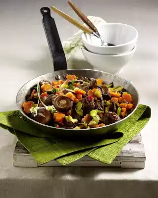 Clean and clean the mushrooms, notching heads crosswise. Cut large mushrooms in half if necessary. Wash the meat, dab dry and cut into strips. Heat oil in a large pan. Brown the meat well in it.