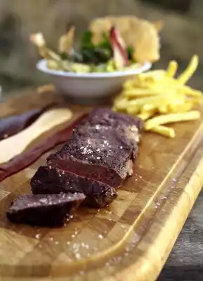 Wrap in aluminium foil and leave to rest for 3-4 minutes. Mix salad and dressing, arrange in bowls, sprinkle with Parmesan shavings and nuts. Arrange steaks, sprinkle with sea salt. Serve with French fries and dips (e.g. ketchup, mayo, barbecue sauce)