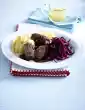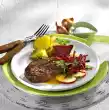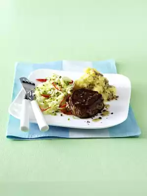 Drain the potatoes. Add the milk and mash into puree. Season to taste with salt and nutmeg. Finally fold in mustard loosely. Keep puree warm. Wrap the meat in aluminium foil and let it rest for about 10 minutes.