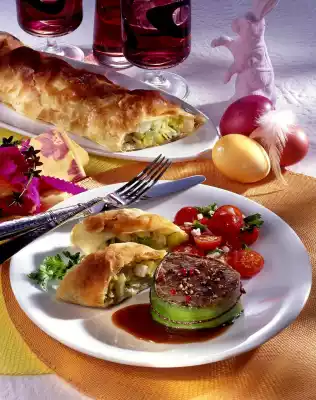 Season with salt and pepper. Add parsley to the tomatoes. Remove the strudel from the oven and cut into 3-4 cm wide slices. Arrange beef steaks with leek strudel, sauce and tomato salad on plates.