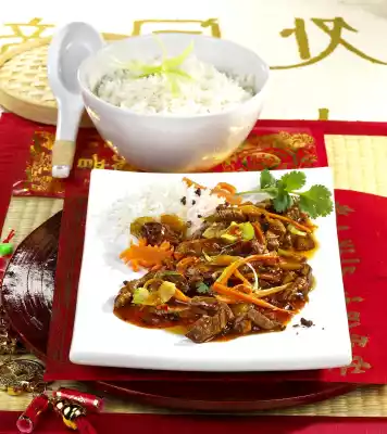 Wash the pod and chop finely. Peel ginger and cut into fine strips. Wash the meat, dab dry and cut into fine strips. Mix potato flour with sugar and salt. Stir with vinegar and rice wine until smooth. Heat oil in a large pan. Brown the meat in it in portions and take it out. Fry Szechuan pepper in hot frying fat, add meat again, stir in Sambal Oelek. Add prepared vegetables, ginger and chilli and fry over high heat for 3-4 minutes, stirring continuously. Add the starch mixture and 250 ml water, bring everything to the boil.