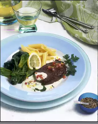 Arrange steak, sauce, spinach and noodles in portions. Serve garnished with parsley and lemon.