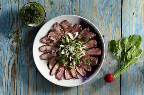Cut the steaks into thin slices and arrange them in a fan shape on a plate. Cut cress from the bed. Mix spring onions, radishes, chopped parsley, cress and sprouts and arrange on the meat. Drizzle with dressing. Garnish with remaining parsley. Sprinkle with coarse salt