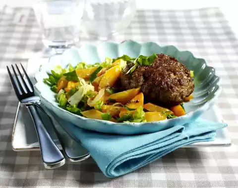 Peel and finely chop the onion. Knead minced meat, breadcrumbs, half of the onion and mustard. Season with salt and pepper. Form 1 meatball. Heat 1 teaspoon of oil in a coated frying pan, fry the meatball for about 10 minutes while turning.