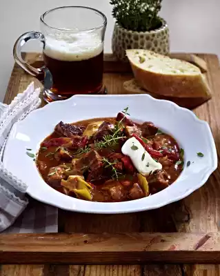 Deglaze with beer, bring to the boil and simmer for about 3 minutes. Add broth, bring to the boil. Season vigorously with salt, pepper and sugar. Stew in a closed roaster for about 1 1/2 hours until soft