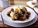 Peel and chop the onions. Peel and finely dice the garlic. Dab both meats dry and cut into cubes. Heat clarified butter in a roaster. Sauté the meat for about 10 minutes. After about 8 minutes add onions and garlic