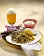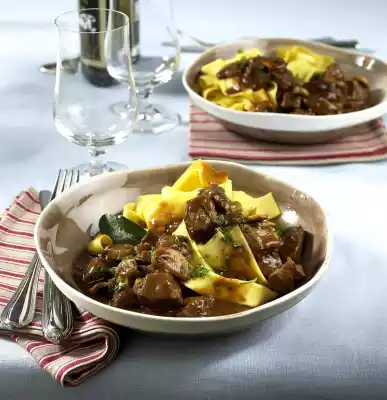 Bring mushrooms and remaining beer to the boil and simmer for 30 minutes. Add mushrooms to the goulash. Cook pasta in boiling salted water according to package instructions. Pour pasta onto a sieve and drain.