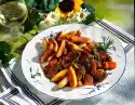 Peel onions and garlic and dice them coarsely. Rinse meat and pat dry. Heat clarified butter in a roaster. Brown the meat in it. Add onions and garlic and fry.