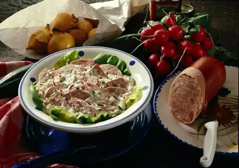 Clean and wash radishes and cucumber. Peel onions. Finely dice all ingredients. Quarter beer ham and cut into slices. Mix cream cheese, yoghurt and mayonnaise.
