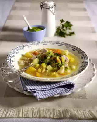 Wash the parsley. Put 4-5 tablespoons of oil, 2 tablespoons of water and parsley in a mixer and puree. Season to taste with chilli, salt and pepper. Mash vegetables and potatoes coarsely. Add the smoked pork loin and warm it up. Season again and arrange on plates with the pesto