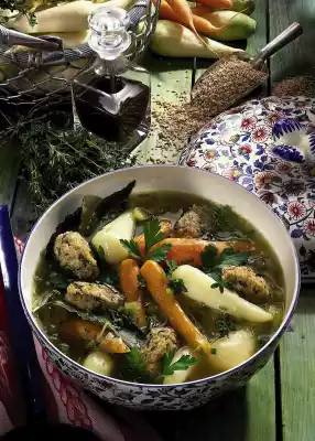 Teltower turnips and carrots peel and wash. Clean, wash and cut leek into thin rings. Heat the fat. Steam the leek for five minutes. Add one litre of water and bring to the boil.