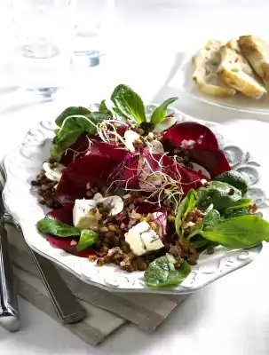 Mix lentils, mushrooms and cheese. Serve with beetroot, lamb's lettuce and sprouts on plates. Serve with baguette bread.