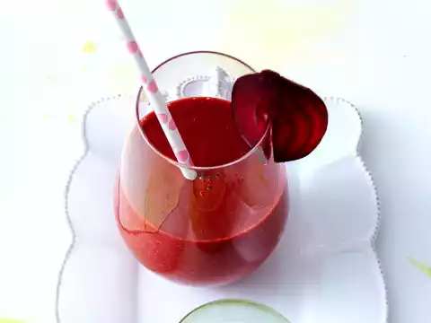 Wash 500 g apricots, halve, stone and cut into large pieces. Peel and chop 1 beetroot (approx. 250 g) and 1 piece (approx. 3 cm) ginger. Put both with apricots, 3⁄8 l carrot juice, 50 g liquid honey and 1 teaspoon rapeseed oil in a blender and puree finely.
