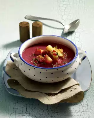 Peel and finely dice the onions, garlic and celery. Melt 1 tablespoon of butter, fry the prepared ingredients in it until translucent. Deglaze with broth and simmer covered for about 15 minutes. In the meantime cut the beetroot into cubes. Pour into the stock, add cream and puree with the chopping stick.