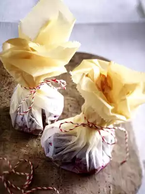 Peel the beetroot, (put on disposable gloves!) and mix with the spice oil. Place 4 tubers in the middle of each parchment paper and sprinkle with remaining spice oil. Fold the paper sides up tightly and tie with kitchen string. Place the parcel on the fat pan of the oven. Bake in the preheated oven (electric cooker: 200 °C/ circulating air: 175 °C/ gas: see manufacturer) for approx. 1 hour