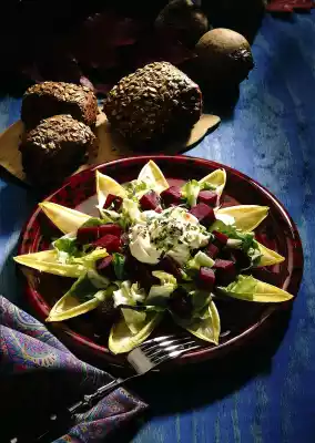 Wash the beetroot and cook in salted water for about 30 minutes. Clean and wash the chicory and endive salad. Remove the outer chicory leaves and line the plates with them. Cut the rest of the chicory and endive salad into strips and arrange them on the plate in a mountainous arrangement.