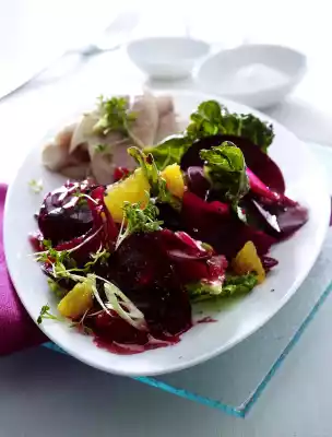 Clean and wash spring onions and cut into thin slices. Drain the beetroot, rinse with cold water, peel skin. Cut beetroot into thin slices. Mix salad, spring onions, orange filets, beetroot and vinaigrette.