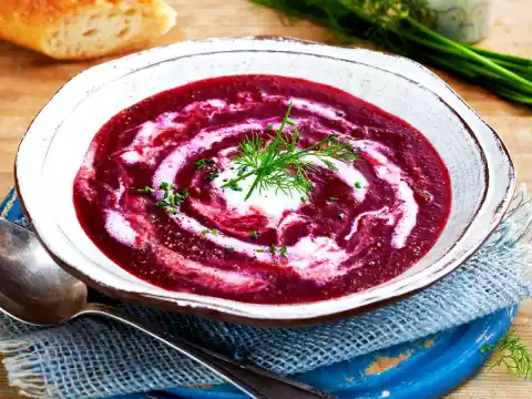 Peel and chop the onion. Roughly dice the beetroot (wear disposable gloves - they stain strongly!). Peel, wash and dice the potatoes. Heat the oil in a large pot. Brown everything in it. 3⁄4 Add l water and broth, bring to the boil. Cover and simmer for about 15 minutes.