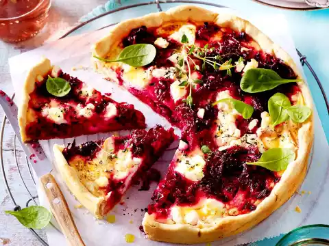 Whisk eggs with crème légère, season with salt. Crumble cheese. Spread red beets and cheese on the pastry base. Pour the egg icing over it and bake in a preheated oven (electric cooker: 175 °C/ convection oven: 150 °C/ gas: see