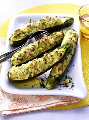 4 Fill the zucchini halves with the stuffing, place them in an oiled oven dish. Sprinkle them with a trickle of oil and Bake for 25q mn approximately.