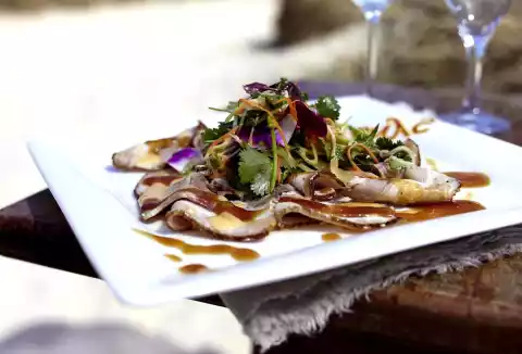 Let the pork belly cool down a little, then cut into very thin slices. Arrange on four plates and sprinkle with the Asian mayonnaise. Arrange the vegetable salad in the middle of the plates. Drizzle 1-2 tablespoons of Teriyaki sauce over each