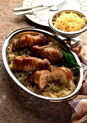 Take out the roulades. Bring the roast stock to the boil and sprinkle with sauce thickener. Bring to the boil again and season to taste. Arrange roulades on the sauerkraut. Pour a little sauce over it. Garnish with parsley. The rest of the sauce is extra.