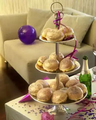 water to a thick icing. Cut the icing in half and colour it pink or purple. Fill into the piping bags and cut off a small corner each. Write your wishes for the new year on the doughnuts (e.g. success, love, happiness) and let them dry again. Arrange on a tier