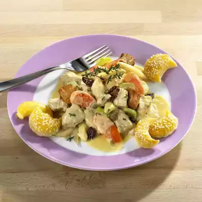 Put all meat into the roaster. Add shallots, garlic, carrots and celery and fry briefly. Season with salt and pepper. Dust with flour and deglaze with stock and wine. Add cloves, thyme and bay leaf, bring to the boil. Braise in the preheated oven (electric cooker: 200 °C/ circulating air: 175 °C/ gas: level 3) for about 45 minutes. Meanwhile drain morels and cut larger morels in half. Drain asparagus and cut into pieces. Whisk 1 egg yolk and cream and stir into the sauce. Season with lemon juice and cayenne pepper. Add morels and asparagus to the fricassee. Garnish the fricassee with capers and thyme and serve with the puff pastry moons (fleurons)