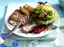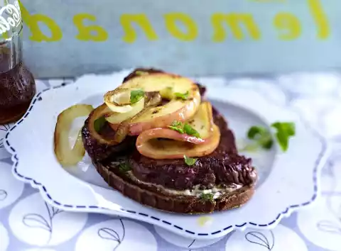 In the meantime spread the breads with butter. Arrange 2 steaks and an apple on each. Spread onions on top, sprinkle with marjoram.