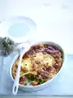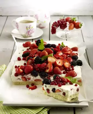 Bake in the preheated oven (electric cooker: 175 °C/ convection oven: 150 °C/ gas: level 2) for approx. 20 minutes. Remove from the oven, place on a cake rack and allow to cool. Clean or sort and wash the berries. Cut strawberries in half. Pluck the currants from the stems. Soak gelatine in cold water. Mix sour cream, yoghurt, lemon juice and 200 g sugar until smooth. Warm 2-3 tablespoons of sour cream slightly. Squeeze gelatine and dissolve in the warmed sour cream. Add 2-3 tbsp. cream, stir, stir everything into the remaining cream and refrigerate.