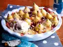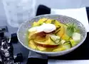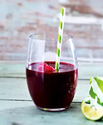 Defrost 100 g each of frozen blueberries and raspberries overnight in the refrigerator. The next morning puree finely with 100 ml apricot nectar and 150 ml kefir with a hand blender.