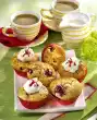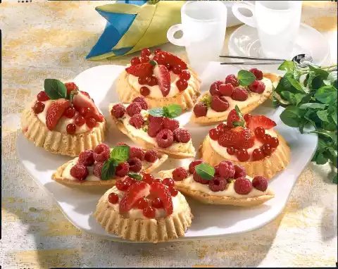 Let it cool down a little bit and stir in yoghurt. Spread over the tartlets. Cover the tartlets with currants and strawberries. Spread raspberries on the boats and sprinkle with pistachios. Leave to set in the fridge for about 30 minutes. Serve decorated with mint as desired