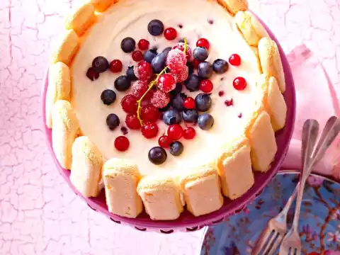 Lightly coat the bottom of a springform pan (20 cm Ø) with oil. Straighten one end of the sponge fingers and place them inside the springform pan. Fill in cream. Chill the cake for at least 6 hours (better overnight)