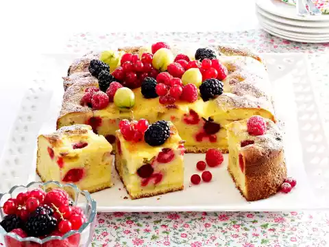 Grease a square (24 x 24 cm) or round (26 cm Ø) springform pan and dust with flour. Wash and clean the gooseberries. Wash the currants and remove them from the stems. Sort the bromeberries and raspberries and wash carefully if necessary.