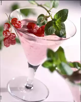 Dilute slightly with milk if necessary. Pour into glasses. Put 4 raspberries on each glass as decoration. Beat the egg white. Sift the remaining currants through and then turn in sugar.