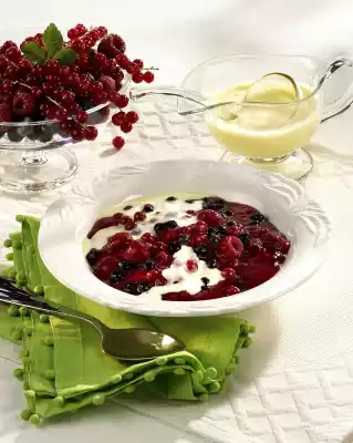 Berries selected. Mix 40 g starch and 6 tablespoons of juice. Put blueberries and currants, 50 g sugar, cinnamon stick and lemon slice in a pot. Stir in the rest of the juice, bring to the boil briefly. Add mixed starch while stirring carefully, simmer for about 5 minutes.
