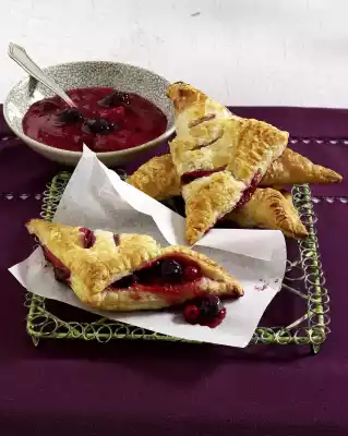 Brush the edges of the dough with a little water and fold the dough diagonally into a triangle. Press the edges of the dough firmly with a fork. Cut triangles on the top and place them on two baking trays lined with baking paper. Whisk the egg yolk and cream, spread a thin layer of the mixture on the packages and bake them one after the other in a preheated oven (electric range: 200 °C/ convection oven: 175 °C/ gas: level 3) for 15-20 minutes until golden brown. Remove. Serve the berry pack lukewarm or cold with the rest of the berry groats