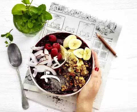 Raspberries selected. Put the frozen bananas, 200 g raspberries, frozen blueberries, almond drink and 3 tbsp honey in a blender and mix until a creamy consistency is obtained. Fill berry smoothie into bowls. Peel and slice 1 banana. Spread banana slices, remaining raspberries, coconut chips and granola on the smoothie and sprinkle Chia seeds over it.