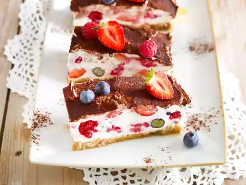 Cut the vanilla pod lengthwise and scrape out the pulp with the back of a knife. Mix curd, mascarpone, vanilla pulp and sugar with the whisk of the hand mixer until smooth. Fold the fruits (except for the uncleaned strawberries and 1/2 tablespoon each of raspberries and blueberries) into the cream. Carefully spread the cream on the lady fingers and refrigerate for about 1 1/2 hours. Halve the remaining 3 strawberries. Dust the berry tiramisu with cocoa and cut into 6 pieces, carefully lift them out of the mould and decorate with the remaining fruit
