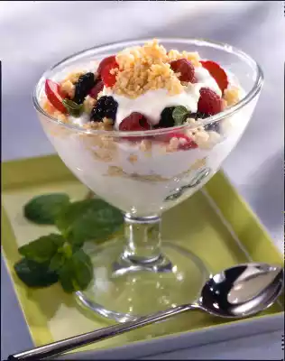 Select 2 berries and wash if necessary. Wash the mint, pluck the leaves from the stalks and chop. Mix yoghurt, lemon juice, millet and mint. Season to taste with sweetener. Serve with berries