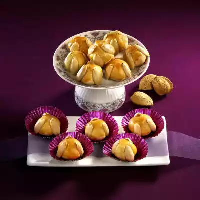 Form small balls with moistened hands. Place on a baking tray lined with baking paper. Whisk egg yolk and cream and brush the balls with it. Press 3 almond halves on each ball. Bake in the preheated oven (electric cooker: 150 °C/ convection oven: 125 °C/ gas: level 1) for about 20 minutes. Let them cool down on a kitchen grid