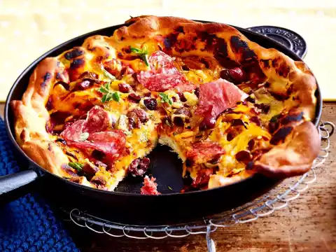 Roll out the dough and place it in a cold ovenproof pan (28 cm Ø). Peel off baking paper, press down the rim. Spread the dough with tomato paste, cover with olives, paprika and cheese.