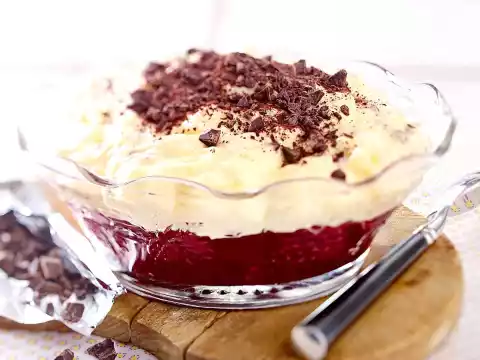 Roughly chop the chocolate. Whip the cream until stiff and allow 1 tbsp. sugar to trickle in. Fold in egg liqueur. Stir the pudding once. Fold the advocaat cream and half the chocolate into the pudding.
