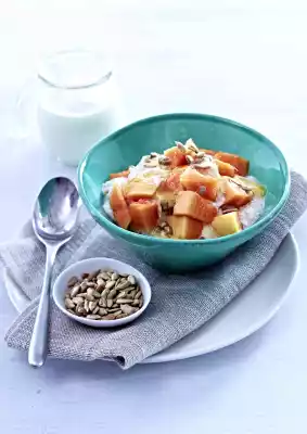 Peel the papaya, remove the seeds and cut the flesh into cubes. Put papaya on the oatmeal yoghurt mixture and sprinkle with honey. Sprinkle with sunflower seeds